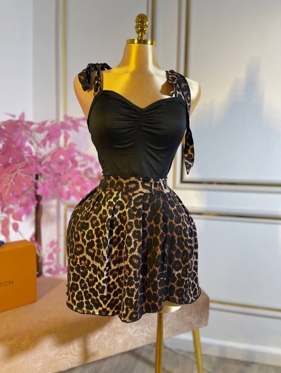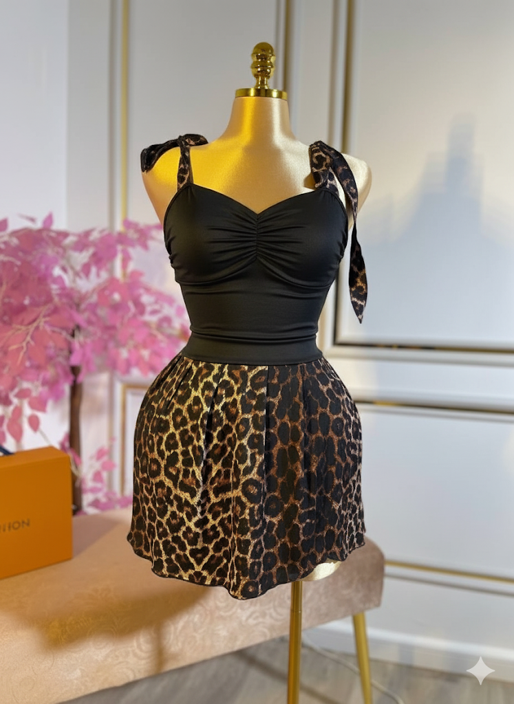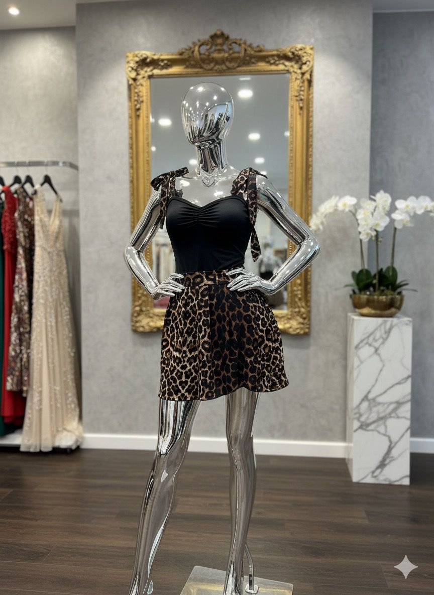 “أطلقي العنان لجرأتك! طقم أنيق يجمع بين حيوية تنورة التايجر العصرية وجمال التوب الأسود الكلاسيكي. إطلالة مثالية لكل مناسباتك! الكود: 2.“