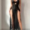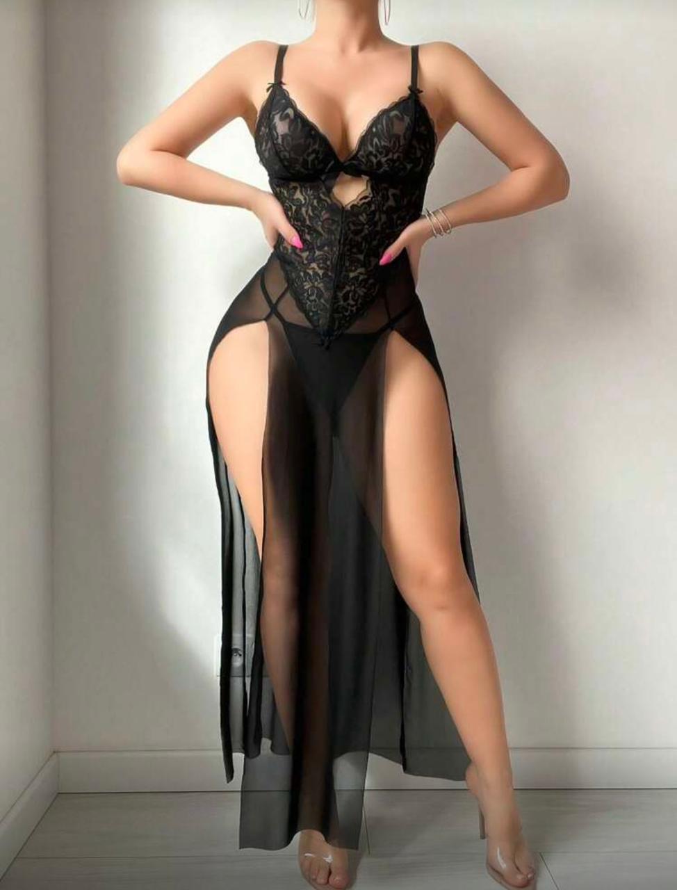لانجيري بيبي دول بتصميم جريء وأنيق من الدانتيل الفاخر والحرير الشفاف. القصة الضيقة تبرز جمال قوامك، والفتحات الجانبية العالية تضفي لمسة آسرة ومثيرة.
